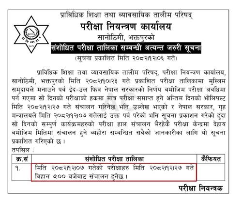 प्राविधिक तथा व्यावसायिक तालिम परिषद, परीक्षा नियन्त्रण कार्यालयको संशोधित परीक्षा तालिका सम्बन्धी अत्यन्त जरूरी सूचना !!!