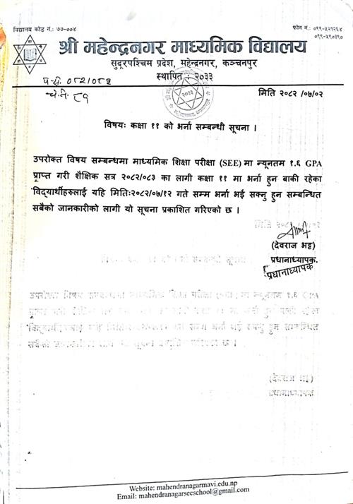 कक्षा ११को भर्ना सम्बन्धी सूचना!!!